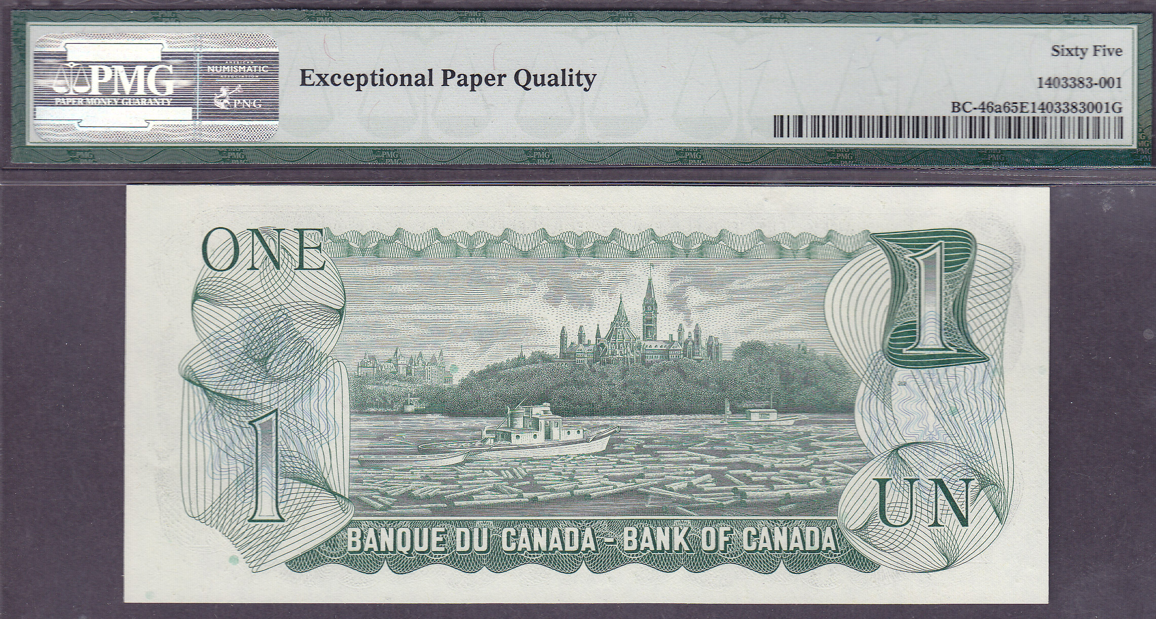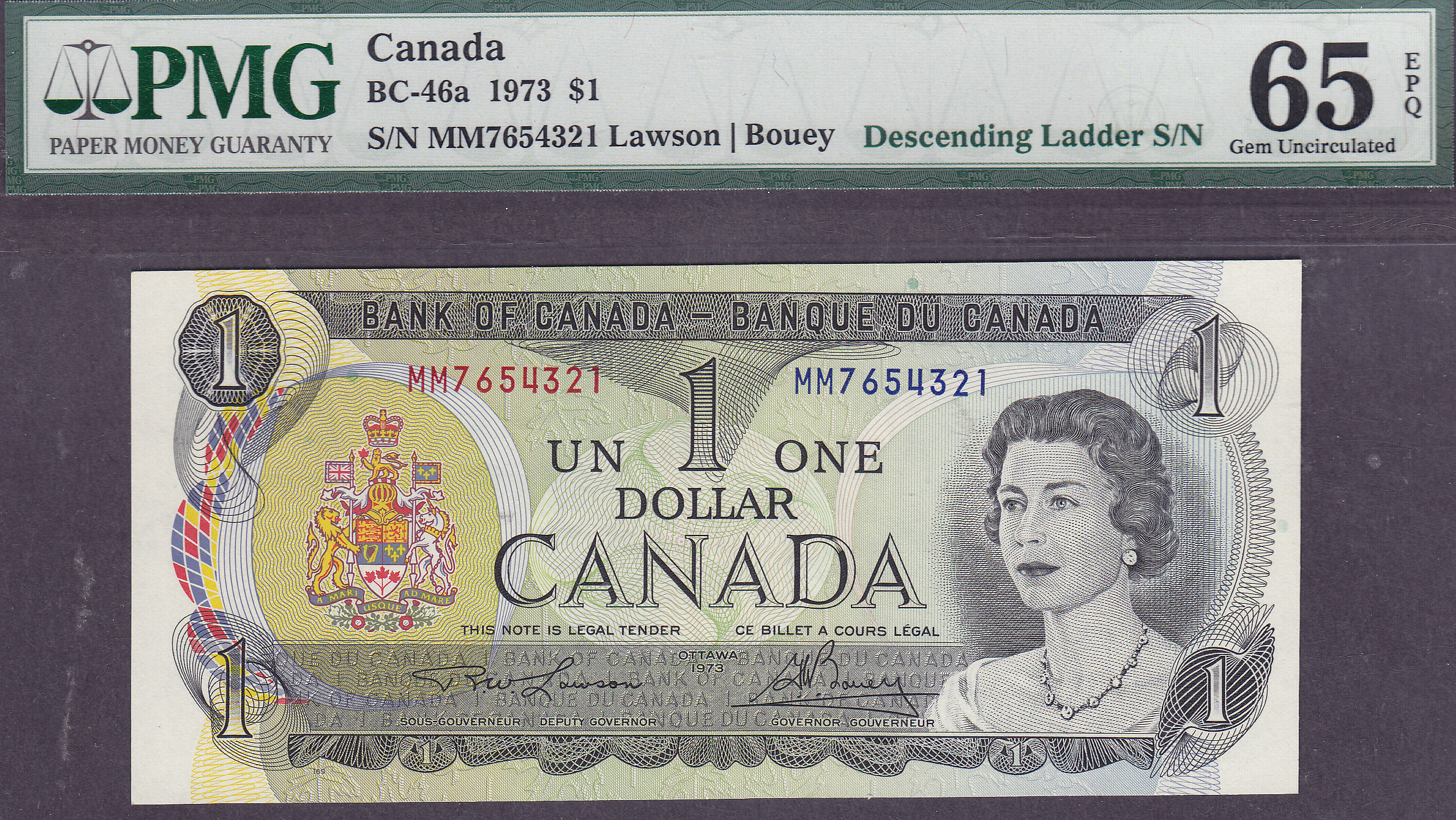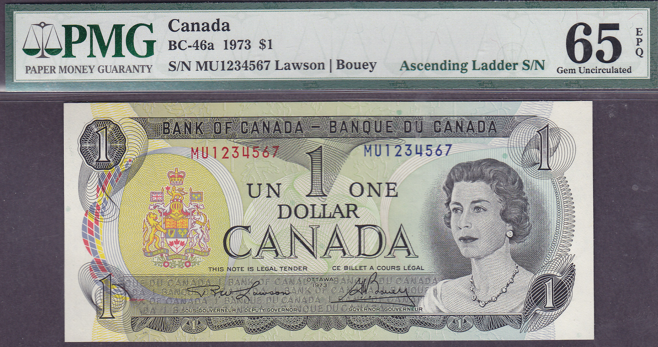 This is a very interesting and unique presentation set of 1973 $1 Canadian dollars. What are the odds of having an up ladder, serial number MU1234567 and a down ladder, serial number MM7654321 together as a set? In all my years of collecting fancy serial number currency I have never seen a set like this on small size notes, in any foreign or American currency. These notes were puller and presented to Dignitaries and were never into general circulation. Both notes are graded as PMG-65EPQ. The notes come in ONE holder with both notes together. It is quite an impressive set for fancy serial number collectors. You will not find a US set like this.