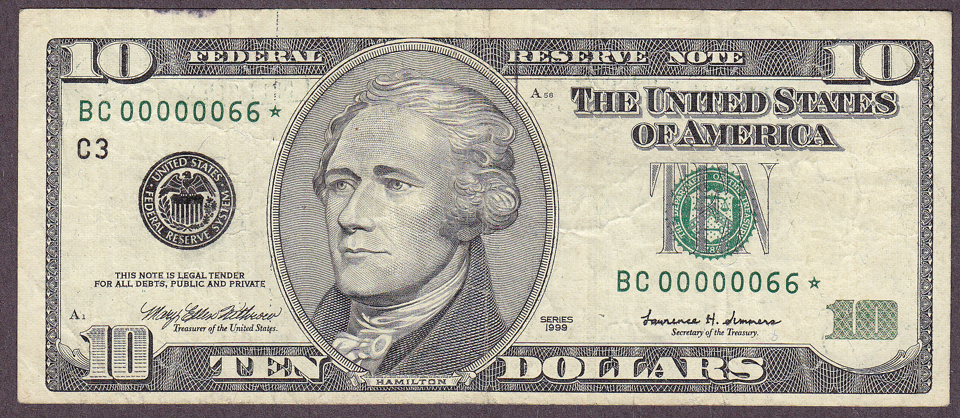 Ckeck out this cool 1999 $10 FRN star from the New York district. It has a solid or radar serial number of BC00000066*. I would grade this a soldi VF+. Check the scans and see for yourself. It is priced to sell.