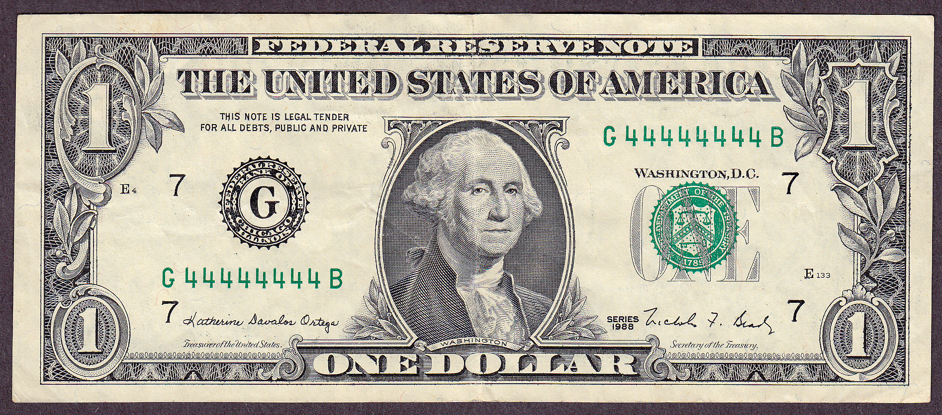 How about a cool serial number G44444444B to play liars poker with your friends. You may win, but you may also get shot! This is a real nice example of a 1988 $1 Chicago FRN with the solid serial number of G4444444B. It is ever so lightly circulated, maybe a AU note that is definitely priced to sell to that liars poker champion.