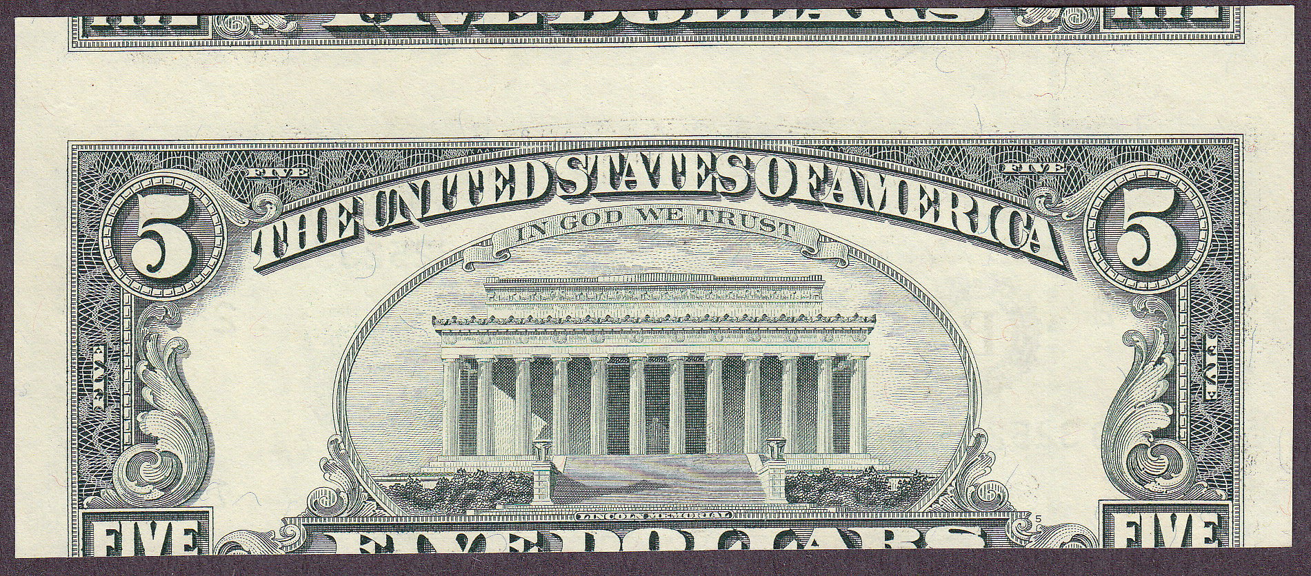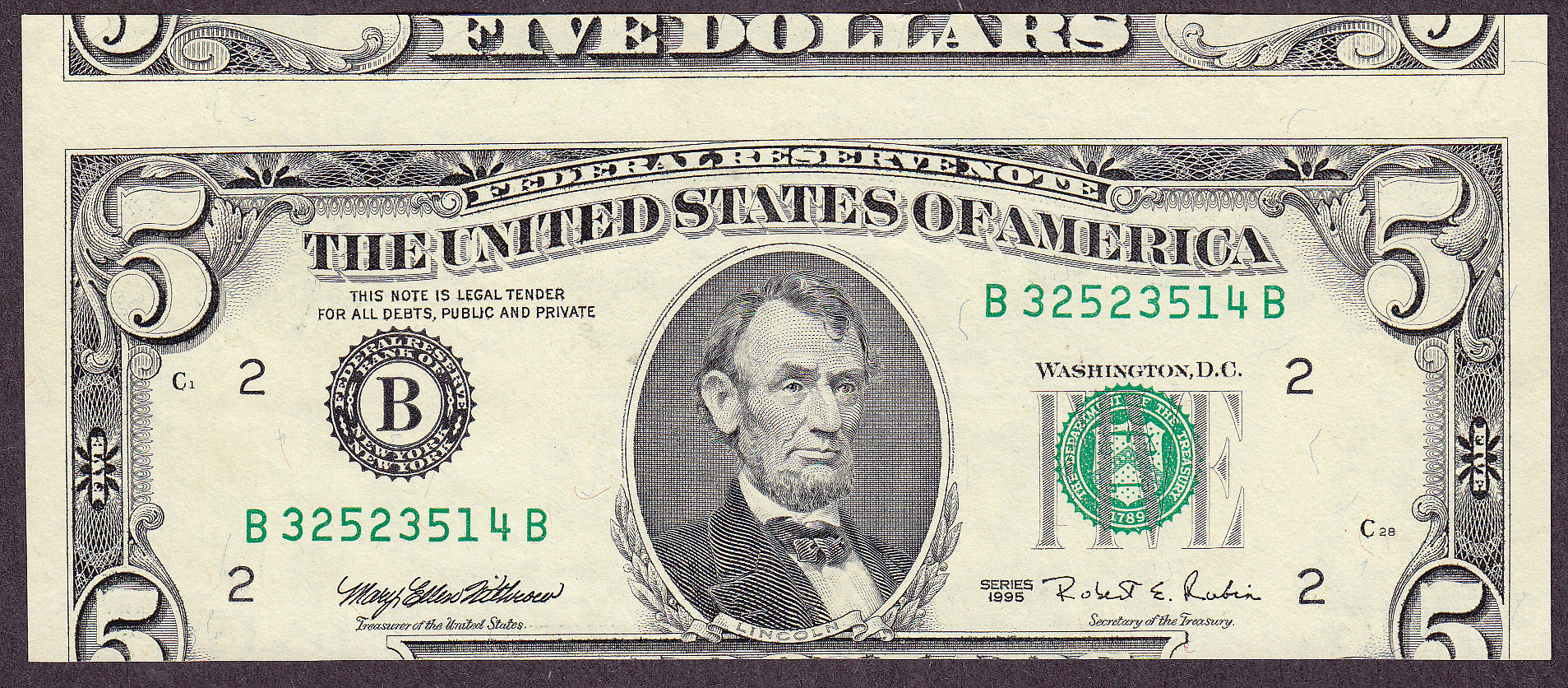 A cool dramatic 1995 $5 misaligned error with top selvage from the other bill shows on the front and back. Most of these show very little of the top. This note appears to be UNC. The serial number is B32523514B.