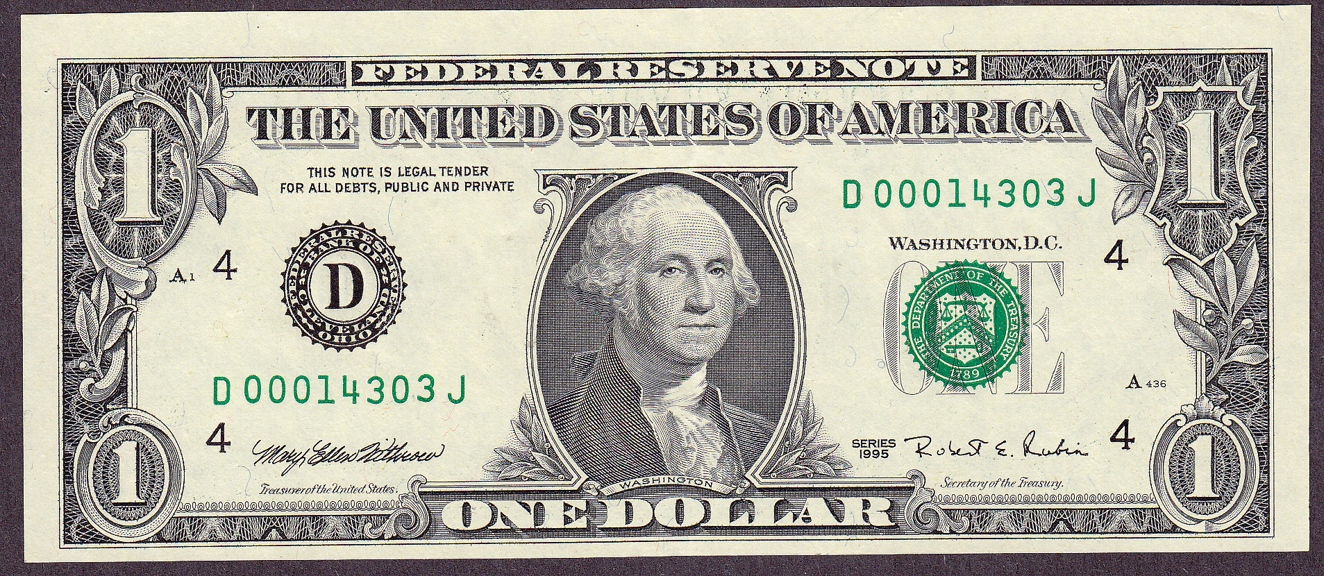 1995 $1 Cleveland FRN (Print Thru on Rev. Error) Ser. # D00014303J Raw