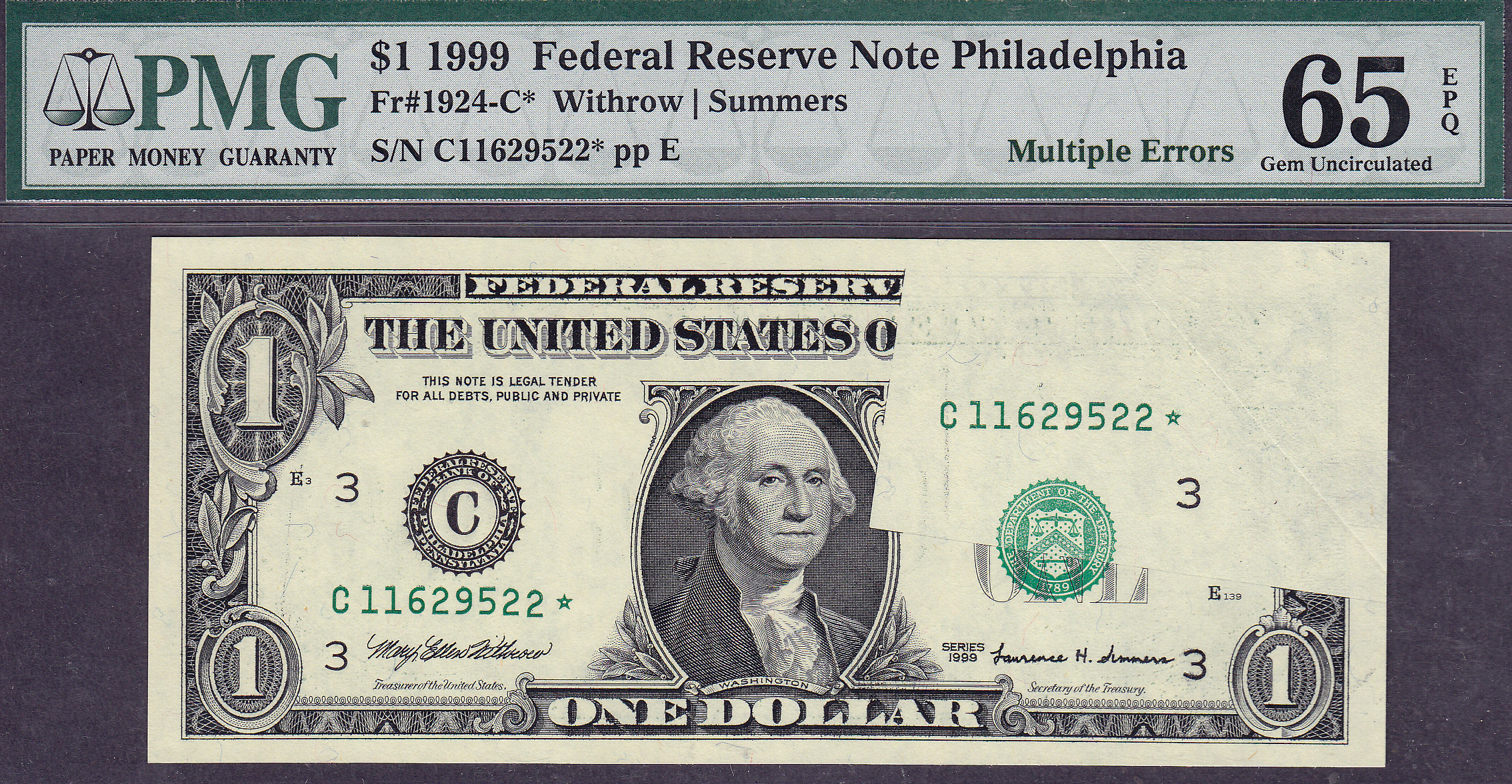 This 1999 $1 FRN from Philadelphia is the only error note I have ever owned that had 4 different errors in one note and on top of that it is a star note. How does a replacement note have errors?