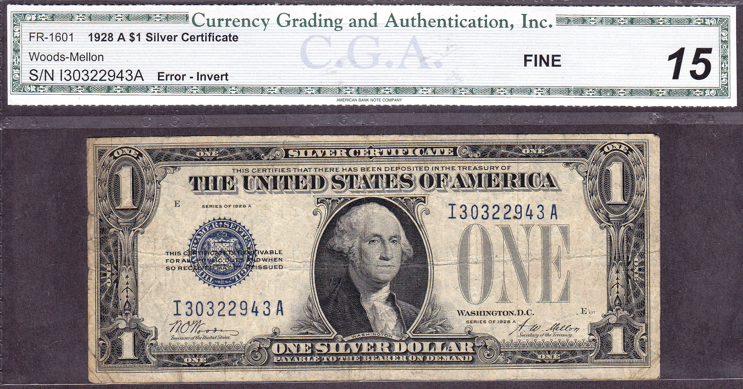 Fr.-1601 1928 $1 Silver Certificate (Inverted Face Error) Ser. # I30322943A CGA-15
